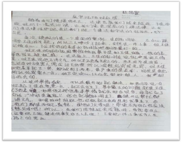 2017年新学期,我校根据我市普校存在的因小事引起打架事件及打群架斗殴事件等在校园中易发多发事件,应普校法治教育的要求编排了新剧本。开始了新的一轮模拟少年法庭进课堂活动。2017年10月18日我校模拟法庭的教师来到了抚顺市东洲区下哈达初级中学,以逼真的场景、惟妙惟肖的模仿一起初中学生因课间操期间一学生的鞋被另一学生踩掉觉得没有面子,遂找表哥和同学对其进行报复而引发斗殴事件的法庭审理过程。在审理过程中对学生进行通过角色的叙述让学生了解了寻衅滋事罪等法律知识及学生之间矛盾的处理方法。在授课期间同学们随着剧情发展认真地做着笔记,并于课后进行了自我反思写了观后感。通过本次互动性和趣味性教育,让青少年在体验庭审的过程中学习法律知识,接受法制教育,增强自我防范和自我保护能力,有效预防青少年违法犯罪,促进青少年健康成长,受到广大师生好评,达到了预期的法治教育效果。